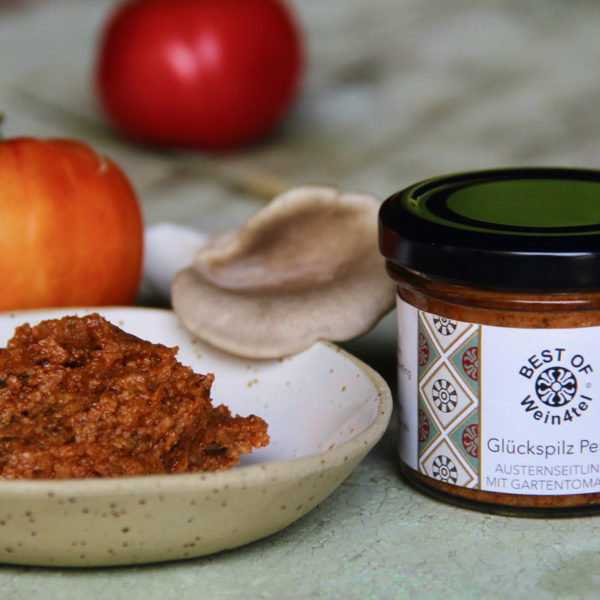 - 1 x Das Glückspilz Austernseitling Pesto mit Gartentomaten, langsam gewachsen in unserer Weinviertler Kellerröhre und im „Hintaus“ – aus eigener Landwirtschaft in Enzersdorf
